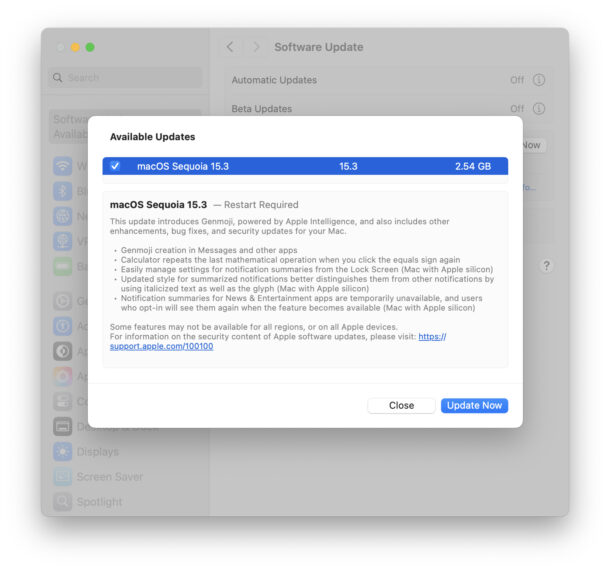 - 稍后您将看到“macOS Sequoia 15.3”可供下载,选择“立即更新”开始下载和安装最新的 Mac 软件更新的过程