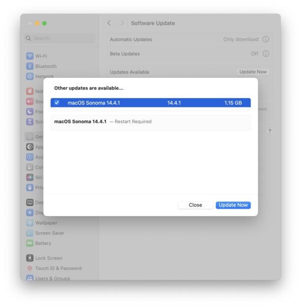 - 选择 MacOS Sonoma 14.4.1 的“立即更新”开始在 Mac 上下载并安装更新