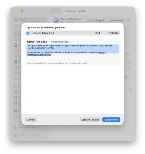 此更新为液态玻璃添加了新的有色选项,以及适用于 Mac 的其他功能、错误修复和安全更新。
