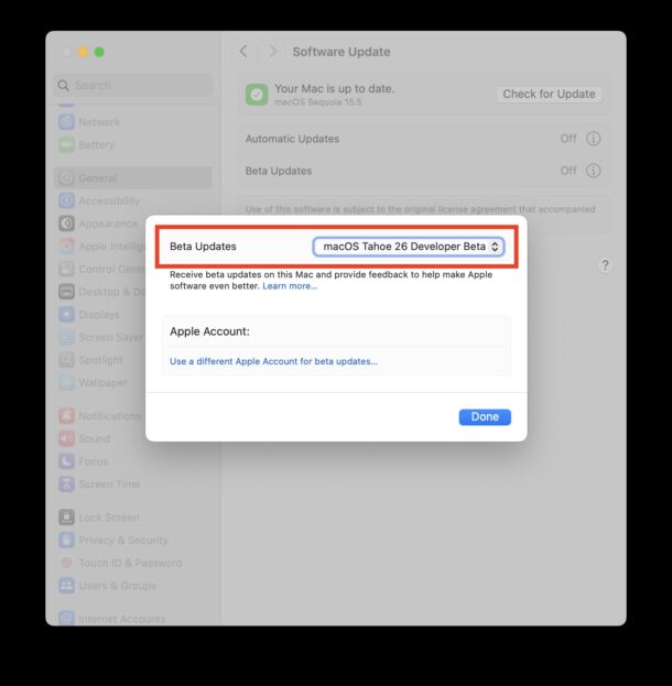 - 从可用的Beta更新列表中选择“ Macos Tahoe 26开发人员Beta”(如果您不可用,请放弃和重新启动系统设置,否则您可能没有在开发人员程序中注册当前的Apple ID)