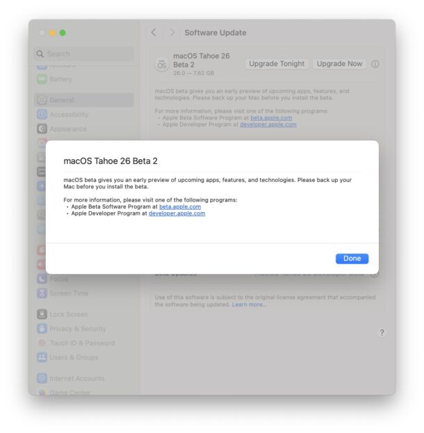 - 对于 MacOS Tahoe 26 beta 3 选择“立即更新”以安装最新的 Beta 更新