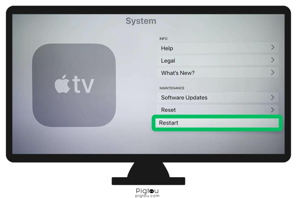 - 在 Apple TV 上,打开设置菜单,导航至系统,然后选择“重新启动”。