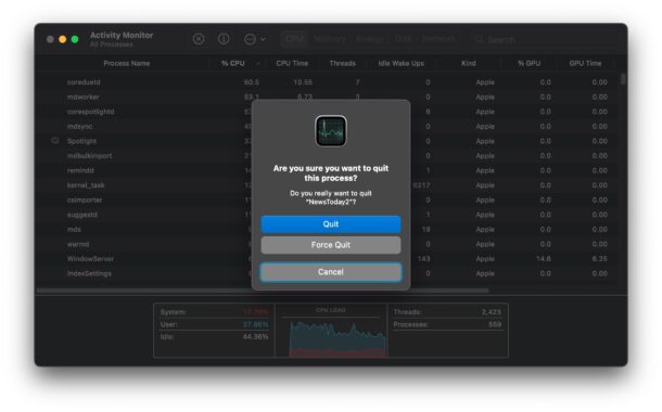- 最后,如果您想结束 NewsToday2 进程,请打开“活动监视器”,找到“NewsToday2”,选择它,然后终止该进程