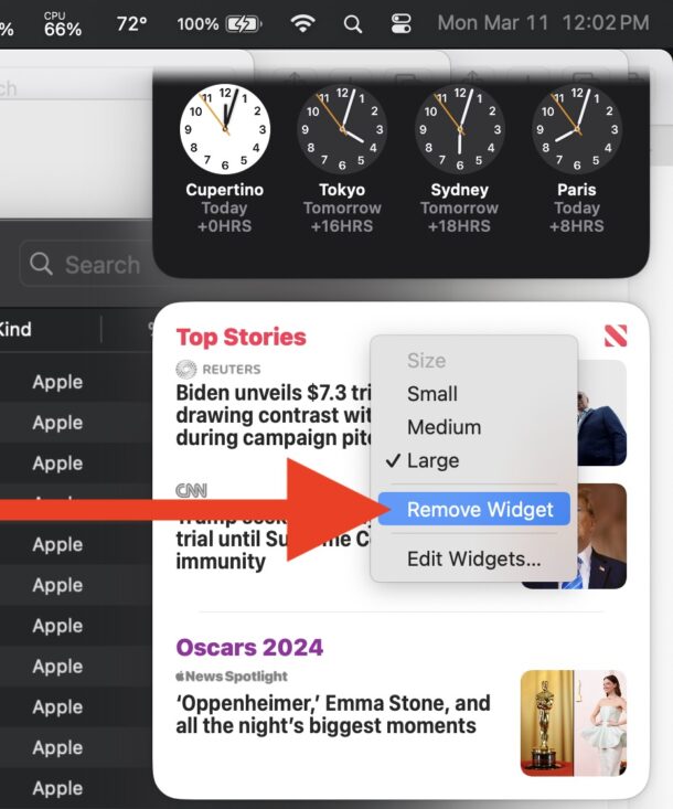 - 右键单击新闻小部件并选择“删除小部件”,从 Mac 桌面中删除任何“新闻”小部件