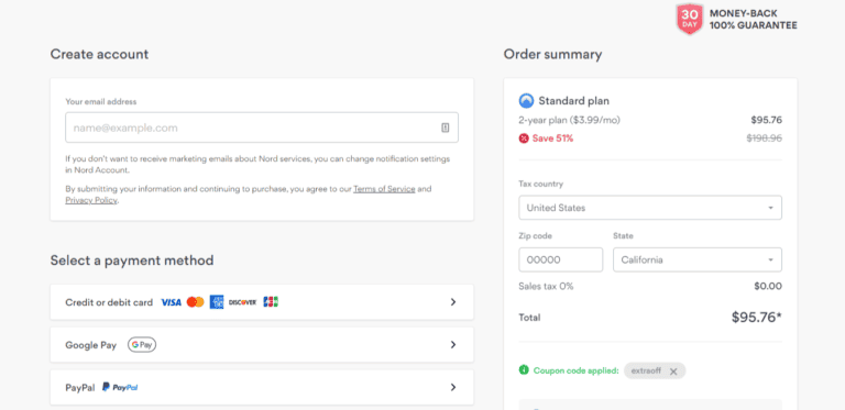 - 输入您的电子邮件地址创建 NordVPN 帐户,然后输入您的付款信息。