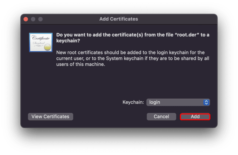 - 标题为“添加证书” 将出现在屏幕上。点击“一个DD” 将证书添加到登录钥匙串。确保“钥匙链” 部分更改为iCloud到登录。