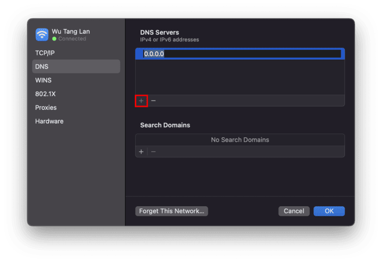 您可以手动将设备的 DNS 设置更改为 NordVPN DNS 服务器地址以绕过 VPN 阻止。对于 macOS: