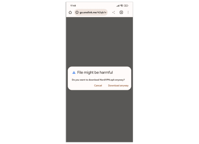 - 下载并安装NordVPN APK。您可能会得到“文件可能有害” 通知。点击“无论如何下载”。