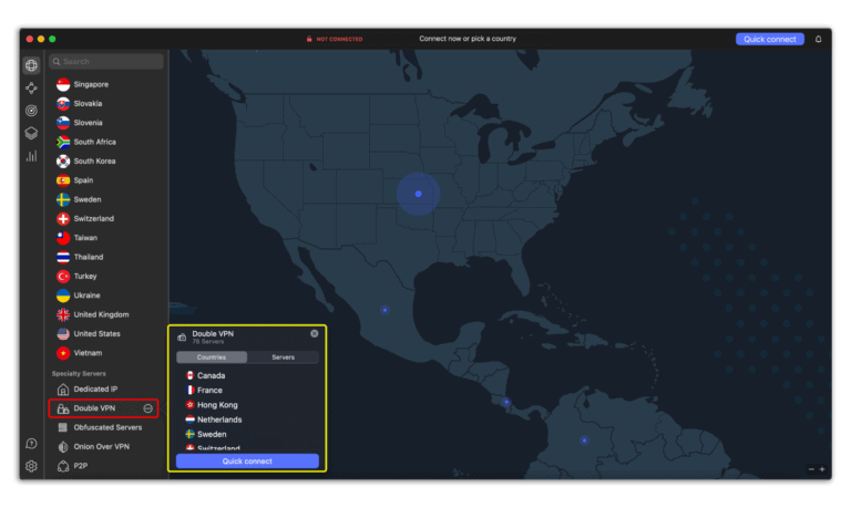 NordVPN 优惠双VPN,它通过两台服务器路由您的流量,对所有内容进行两次加密以实现双重安全。