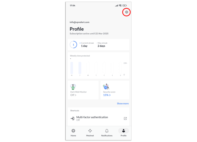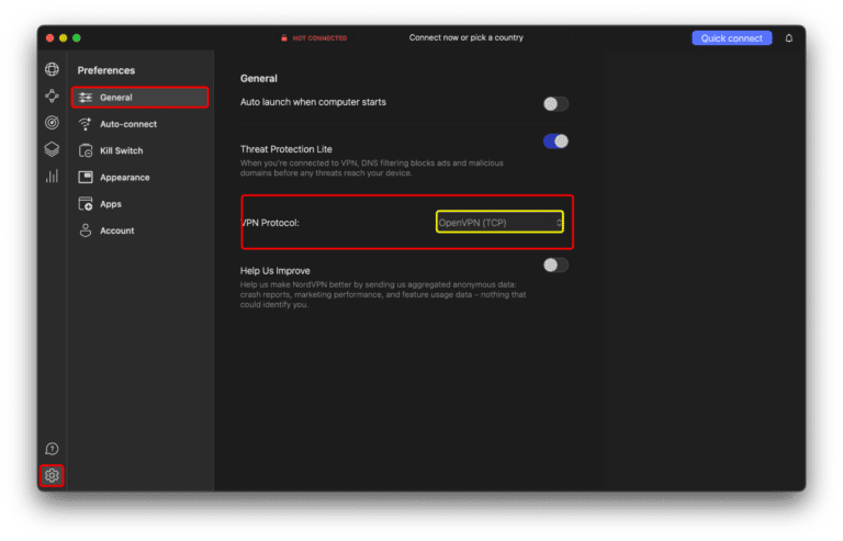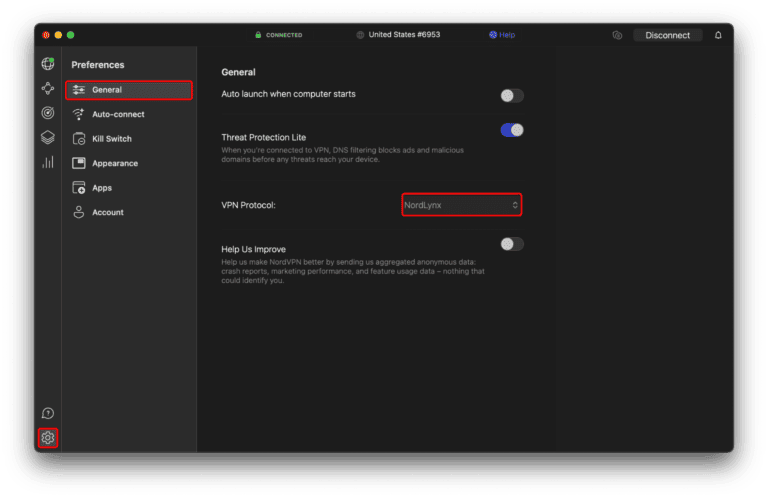 - 打开应用程序“设置”,点击右下角附近的齿轮图标,然后点击“一般的,”转到“VPN协议,”并切换到NordLynx 协议。