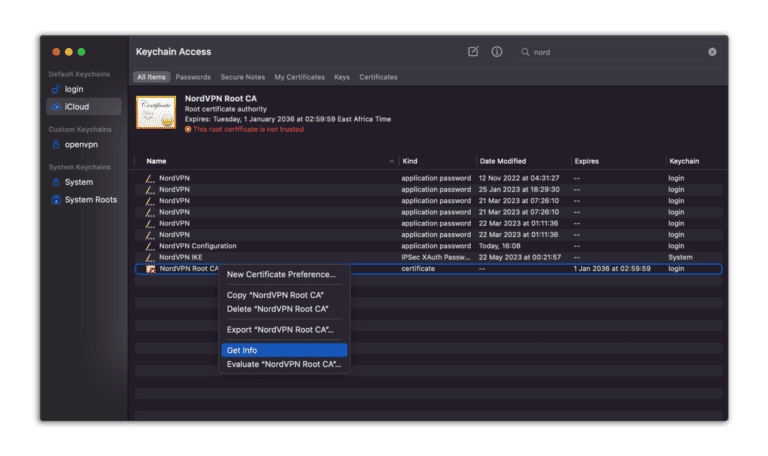 - 搜索 ”NordVPN 根 CA” 在搜索框中右键单击它。选择“获取信息” 从下拉列表中。