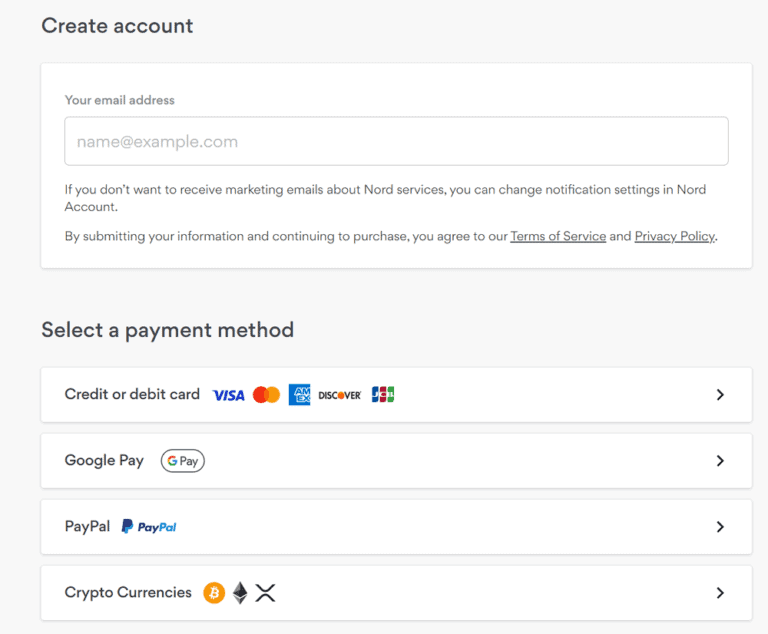 - 提交您的电子邮件地址并选择您首选的付款方式创建您的 NordVPN 帐户。