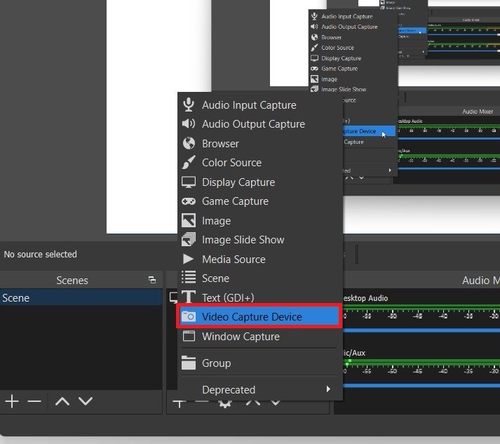 要裁剪视频捕获源并调整其大小,您需要视频捕捉源已添加到您的来源控制板。如果未添加,只需导航到屏幕底部的“源”面板即可。单击+图标朝左下角并选择视频采集设备。