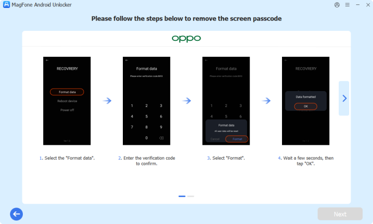 请按照以下步骤设置您的 OPPO 手机。操作完成后,点击下一个。等待几分钟。 MagFone 会将您的 OPPO 手机恢复出厂设置并擦除所有数据。