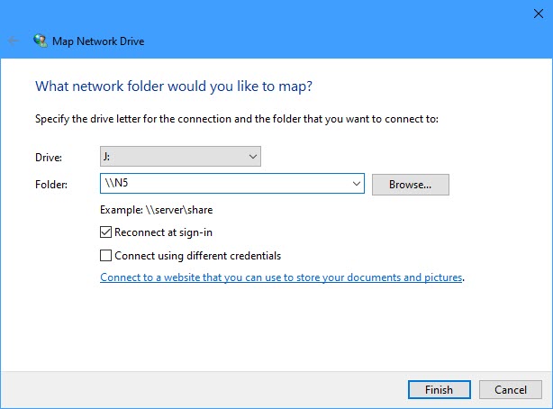 您可以为远程磁盘选择一个驱动器号,然后单击“浏览”按钮在 nwtrok 上搜索该驱动器。或者,您可以直接在文件夹框中键入驱动器的网络地址。确保选中“登录时重新连接”框,否则下次重新启动或注销电脑时,连接将被断开,并且如果访问远程磁盘的用户名和密码与您在电脑上的帐户使用的用户名和密码不同,则会使用不同的凭据进行连接。