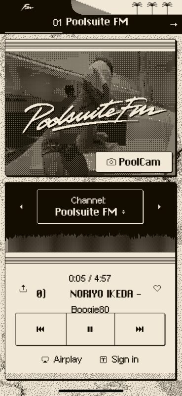Poolsuite FM 中有 7 个不同的“广播”电台可供您收听,每个电台都有不同的主题或氛围,但可以肯定的是,每首歌曲都是欢快、舞蹈、时髦的,让您感觉就像置身于 1984 年迈阿密某个泳池边。