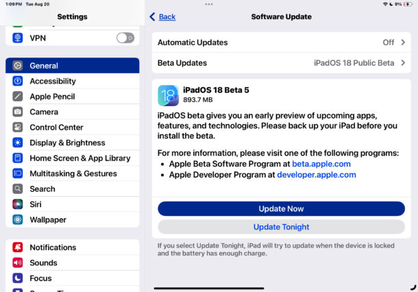 - 选择“立即更新”安装 iOS 18 Public Beta 5 或 iPadOS 18 Public Beta 5