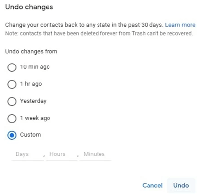 在您选择的时间之后保存的联系人将被删除。因此,为了避免丢失这些联系人,请记得备份它们。
