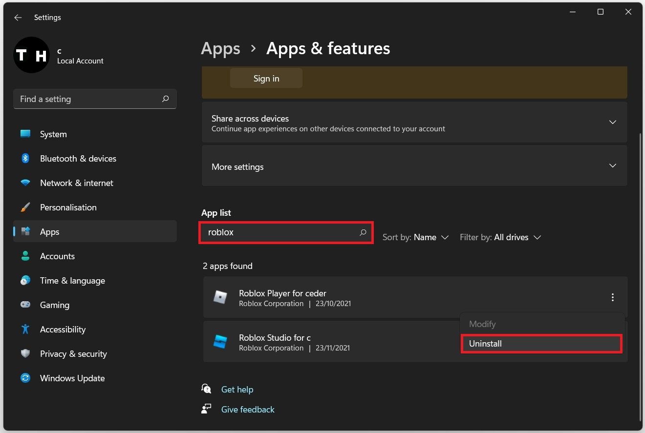 在您的应用程序列表中,搜索 Roblox。单击 Roblox 播放器的汉堡菜单并选择卸载。从系统中卸载 Roblox 应用程序需要几秒钟的时间。