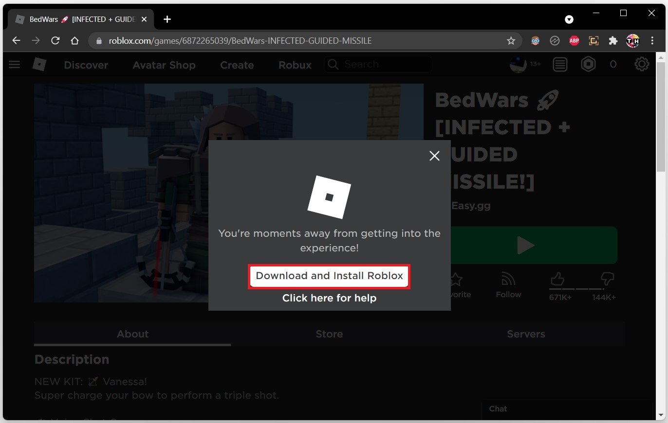 要重新安装 Roblox Player 应用程序,请导航至Roblox.com在您最喜欢的浏览器上并选择玩游戏。然后,系统将提示您重新下载该应用程序,这将需要一分钟的时间才能安装到您的系统上。