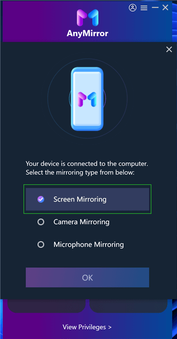 步骤 2. 然后在计算机上启动 AnyMirror 并使用 USB 线连接您的 iPhone > 在计算机上选择“屏幕镜像”并点击“确定”。