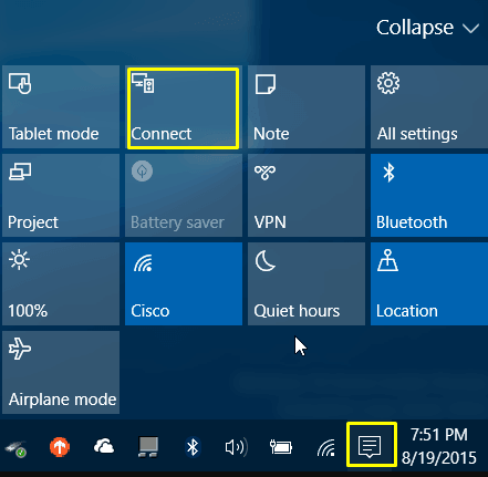 2. 打开Windows 操作中心从任务栏并点击连接选项。