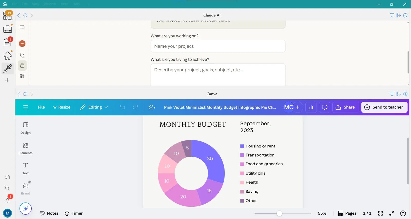 想象一下准备每月的数据演示:您可以一方面使用 Canva 来设计幻灯片,另一方面使用 Claude AI,帮助您在将数据转化为视觉效果之前处理和解释数据。这是节省时间并使一切顺利进行的简单方法。