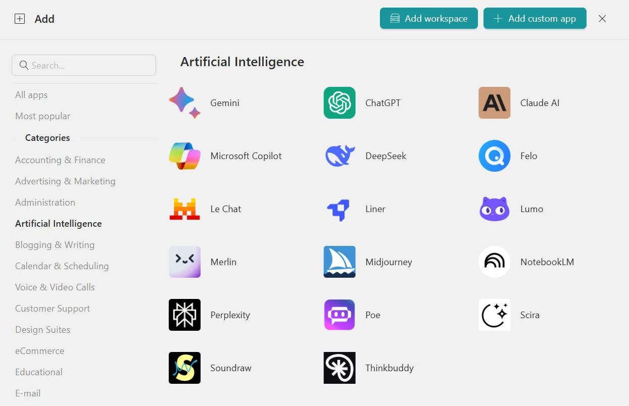 你可以直接在 Rambox 中找到所有这些工具。只需添加一个新应用程序,前往人工智能类,并将您最喜爱的内容带入您的工作区,以便将它们放在您需要的地方。