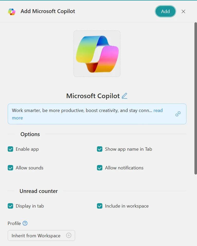 - 点击“+添加”,就是这样!该应用程序已添加到您的 Rambox 工作区!