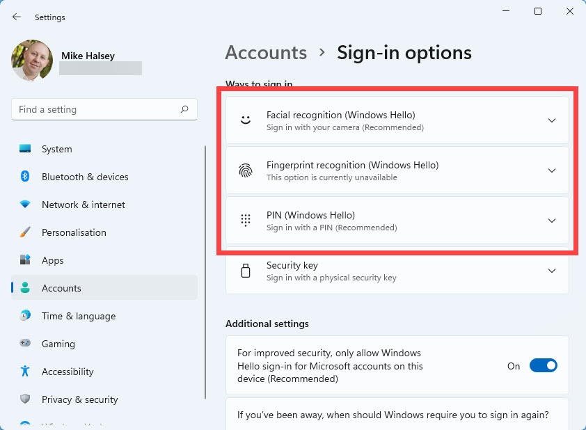 如果你有兼容的硬件,例如支持红外检测的网络摄像头,或者笔记本电脑掌托或触控板上内置的指纹识别器,Windows 11 允许你在电脑上执行相同的操作。 Windows 11 中的生物识别技术称为 Windows Hello,可在“设置”中单击“帐户”,然后单击“登录”选项来激活。