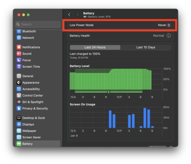 您可以通过转至系统设置 > 电池 > 并将低功耗模式设置切换至“从不”位置来关闭 MacBook Pro 或 MacBook Air 上的低功耗模式。