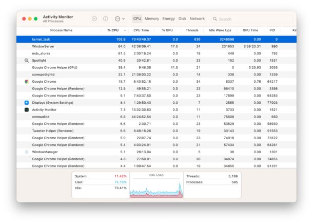 按“内存”排序,您可能还会发现某些应用程序甚至某些系统进程使用过多的内存,甚至具有大量物理 RAM 的 Mac 也会很快耗尽可用内存,从而使计算机变得缓慢。由于内存使用而导致性能下降的唯一真正解决方案是关闭不必要的窗口和应用程序,并同时运行更少的应用程序。