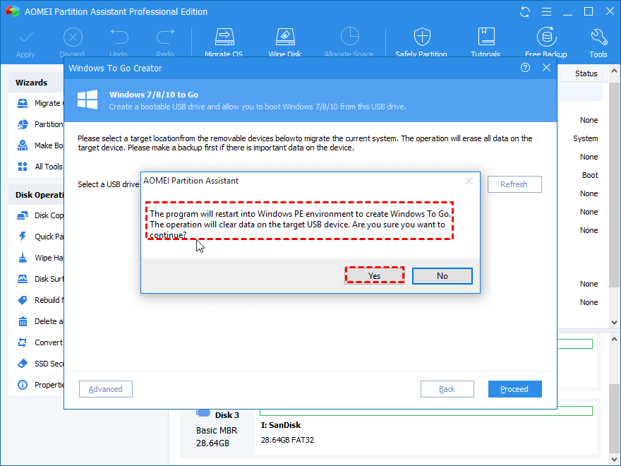 步骤 3. 选择 Windows To Go 选项。单击“开始”,然后单击“是”确认。