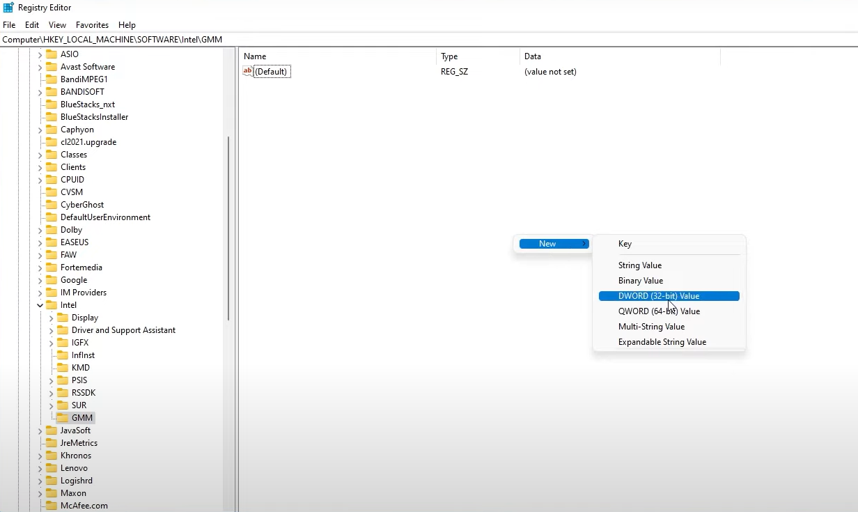 步骤 3:选择新的 GMM 文件夹,在右侧 Windows 窗格中右键单击(或点击并按住),然后选择新建 > DWORD(32 位)值。