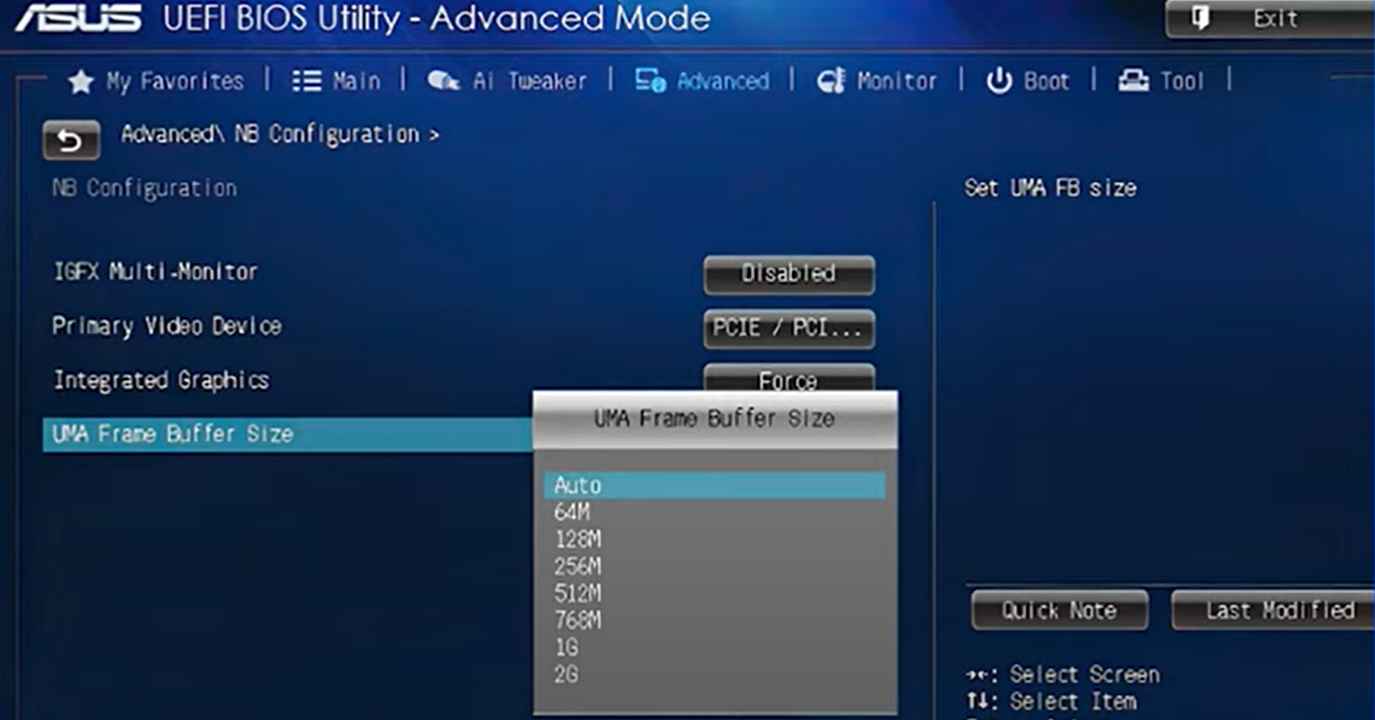 如果您的 BIOS/UEFI 提供该选项,您可以选择 128MB、256MB、512MB 或 1024MB 等内存大小来分配给板载 GPU。为了获得最佳性能,请选择 2GB 系统内存为 256MB、4GB 系统内存为 512MB、8GB 系统内存为 1024MB。