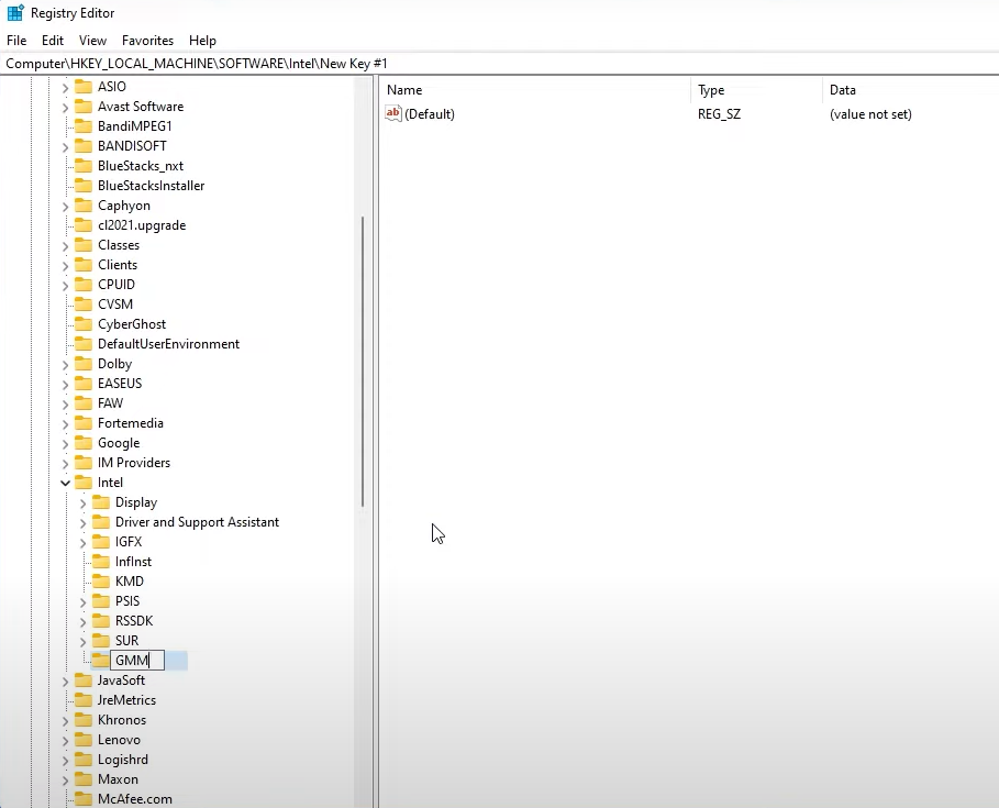 步骤 2:右键单击(或点击并按住)Intel 或 AMD 文件夹,选择“新建”>“密钥”,并将其命名为“GMM”。
