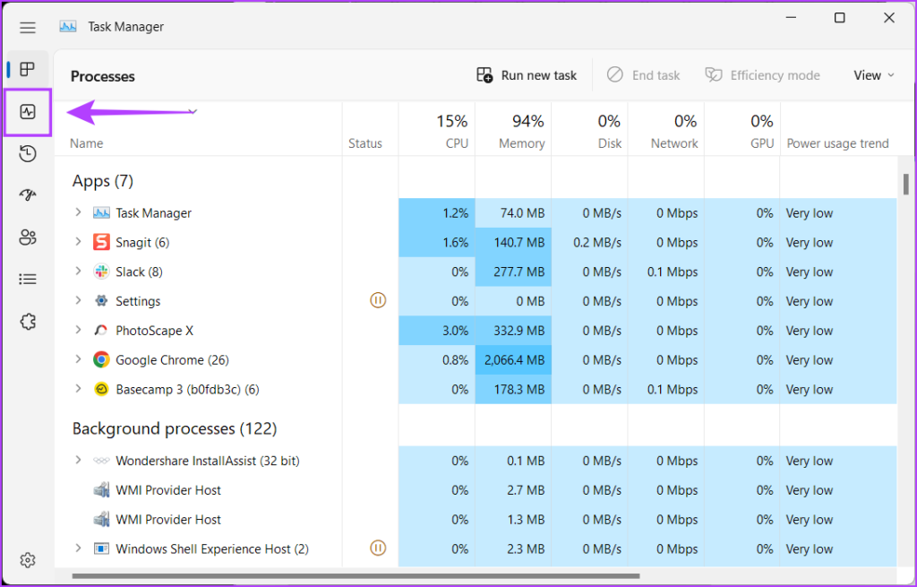 步骤 2:在“任务管理器”窗口中,单击左侧工具栏上的第二个图标以转到“性能”选项卡。