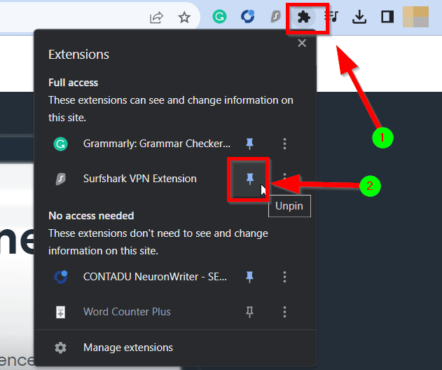 - 单击扩展图标,然后单击附近的销钉Surfshark VPN扩展。”这样,您始终可以轻松地访问扩展名。