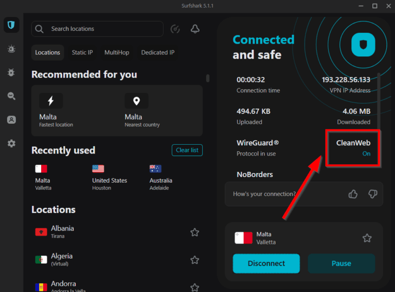 同样,在启用CleanWeb以使其工作后,您必须连接到Surfshark服务器。