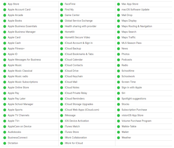 在排除故障之前,请检查是否苹果的 iCloud 服务器通过访问“系统状态”页面来关闭。服务器旁边的绿色圆圈表示服务器运行良好。如果 iCloud 帐户和登录出现故障,身份验证问题可能会暂停同步,而 iCloud Drive 和 iCloud 备份中断可能会中断文件同步和备份。照片或消息等其他基本服务也可能会影响 iCloud 同步。如果任何服务遇到问题,最好的解决方案是等待 Apple 解决。