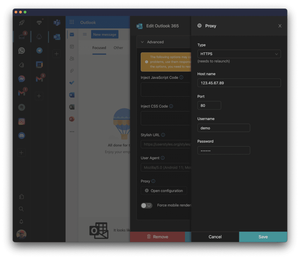 Rambox 突出的安全功能之一是它支持代理,有助于保护您的互联网连接并在您工作时保证您的数据安全。代理充当您的设备和互联网之间的中介,为您的在线活动添加额外的隐私和安全层。