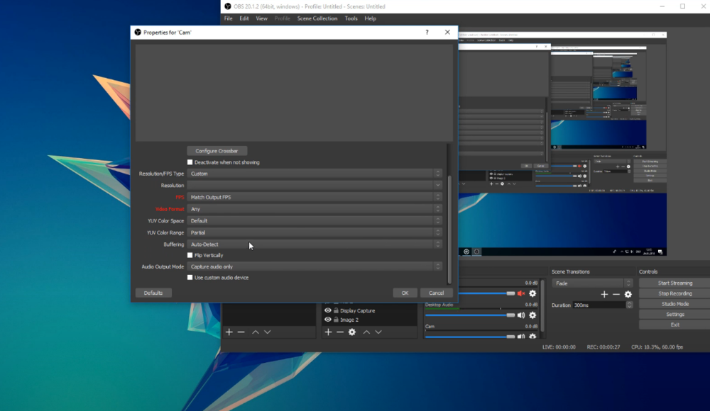 OBS 源 > 视频捕获设备 > 设置 > 分辨率/FPS 类型