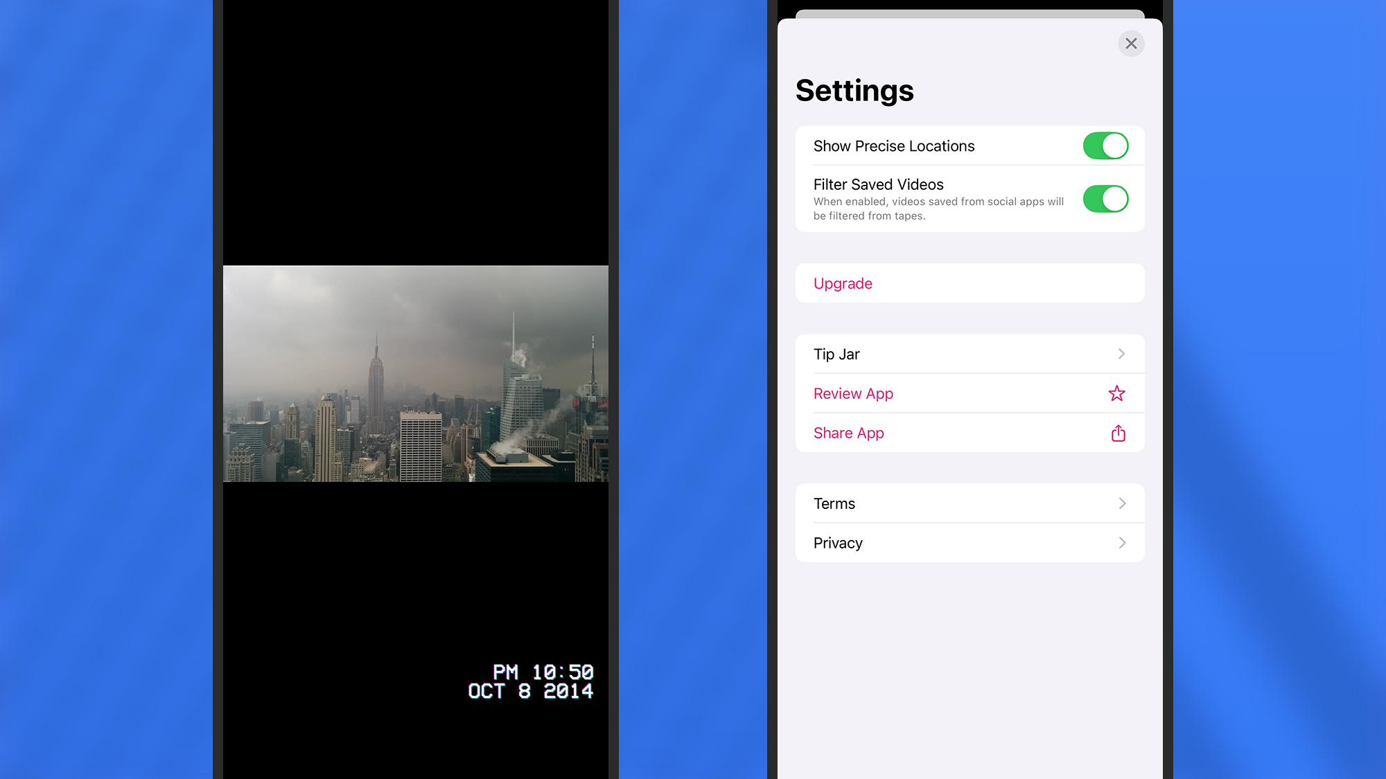 要获得更加身临其境的感觉,请点击顶部的电视屏幕。这将以全屏模式显示您的视频,并在顶部覆盖老式 VHS 标记,显示视频的拍摄时间和地点。在此模式下,您可以点击剪辑一次以再次调出播放控件;点击弹出(最左侧)返回主界面。