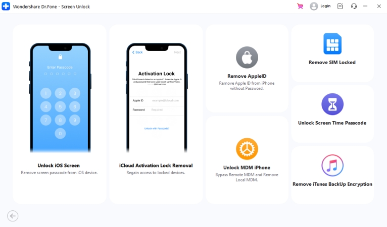 丰博士是适用于 iOS 和 Android 设备的完整移动设备解决方案。它可以解决许多场景的问题:从系统故障到手机解锁等等。屏幕解锁是 Dr.Fone 中的功能之一,用于帮助 iOS 用户摆脱屏幕锁定并删除 MDM。此功能还可以删除 Apple ID 并关闭屏幕时间,无需密码。它与 iOS 设备和 Android 设备兼容。