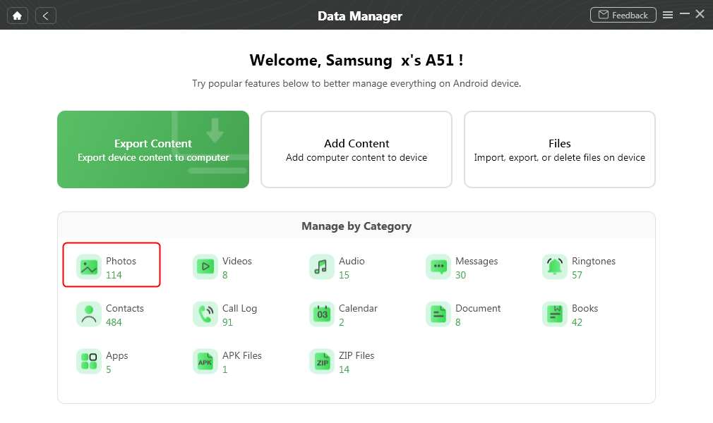 步骤2。 通过 USB 数据线将 Android 手机连接到计算机 > 选择您要传输的任何数据类别。