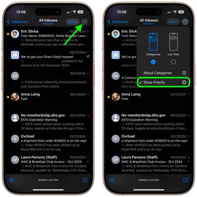 禁用“显示优先级”后,“邮件”将不再将优先级电子邮件显示在收件箱顶部。