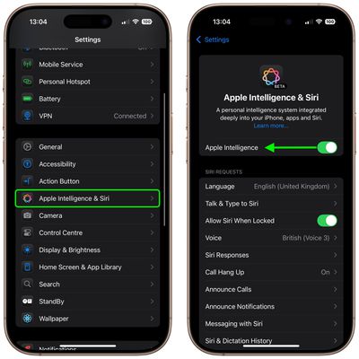 完全禁用 Apple Intelligence 只需要拨动相关开关即可设置 ➝ Apple Intelligence 和 Siri。