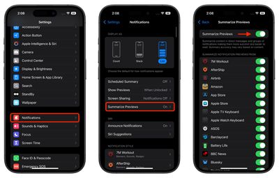 新的摘要功能通过分析通知内容并创建更简洁的版本来突出显示最重要的信息。默认情况下,它对兼容的应用程序启用,但您可以轻松将其关闭。您可以完全禁用该功能或自定义哪些应用程序使用该功能,从而完全控制通知在 iPhone 上的锁定屏幕和通知中心中的显示方式。