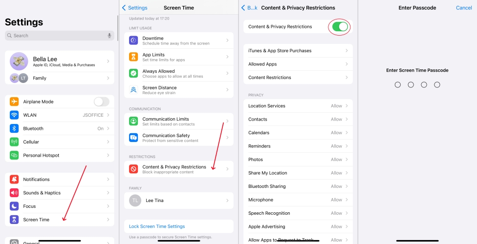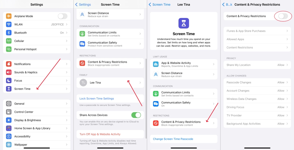 步骤2。轻敲屏幕时间 > 内容和隐私限制。