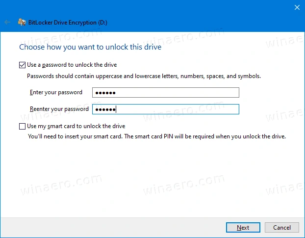 步骤 4 — 当您打开 BitLocker 实用程序时,它会询问您希望如何解锁驱动器。如果您想向驱动器添加单词,请单击“使用密码”并为其设置新密码